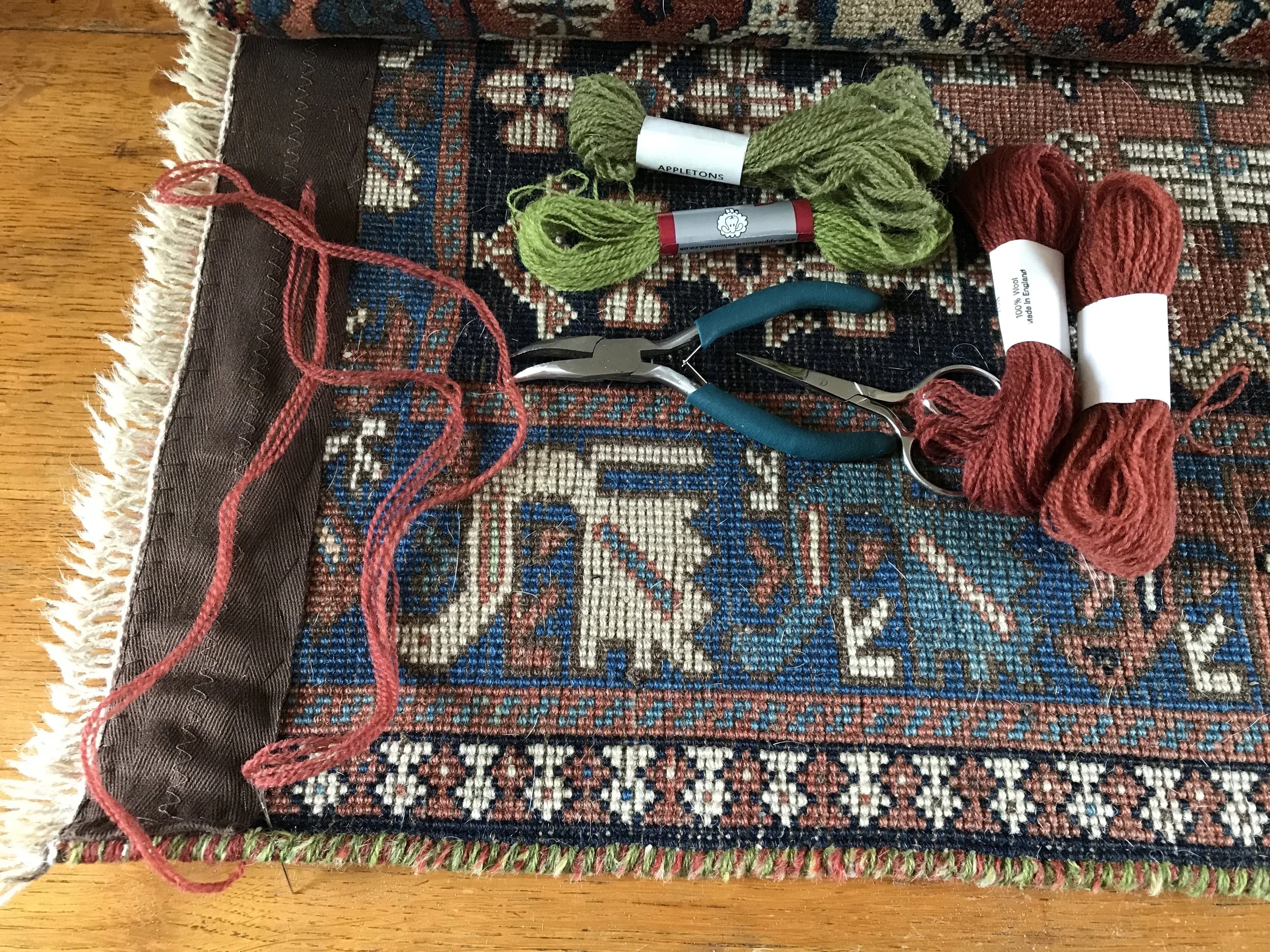 Stabilisation of a small rug seen from the reverse. Short warp ends secured and worn selvedge oversewn with appropriate coloured wool.